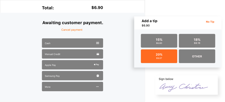 Show customers what they are buying and allow them to initiate payment, add a tip, or sign on a customer-facing display.