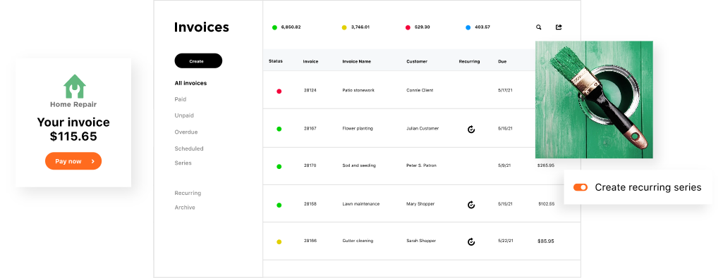 Invoicing how you need it. Make it one-time or recurring, itemized or a custom amount, and send by email or SMS text. Customize with your brand and business information. It's everything you need to never miss a payment while making your customers happy.