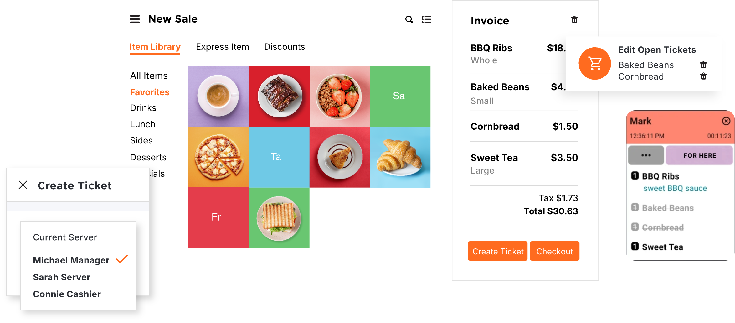 Create a ticket or use a credit card to keep an open tab. Add items to update open tickets, then send them to the kitchen quickly and easily.